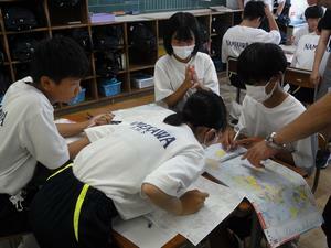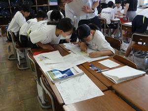 本日、市教委学力向上アドバイザーによる社会科の授業参観がありました。地図帳を活用して宝探しをするゲームで、緯度と経度について学習をしました。