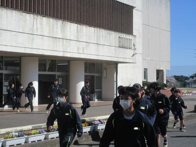 第1回避難訓練(地震想定)を行いました 投稿: 承認者 (17:13) 本日6校時に、地震を想定した避難訓練を実施しました。本校は海抜11.2mに立地しているため、津波の発生も想定し、6号国道への避難を行いました。生徒たちは、終始真剣に訓練に取り組んでいました。 訓練後の講評では、校長先生から「緊急時には、自分の命は自分で守ることも大切である」とのお話がありました。 Tweet -
